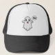 Magnifique personnage fantôme de dessin animé avec un visage heureux et les bras vers le haut en essayant de parler de façon mignonne. Il y a une bulle de discours à côté du fantôme disant "Boo !". Ce casquette est un accessoire amusant pour la saison éffrayante et le temps d'Halloween.