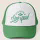 Liverpool Co-ordinates Mesh Trucker Hat. Vintage script design in green, with the coordinates of the great city of liverpool, and the year the city the founded.