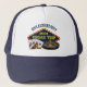 Personnalisez vos propres chapeaux de voyage de garçon pour un séjour à Las Vegas. Un chapeau cool avec des éléments de casino tels qu'un jeu de cartes, des jetons de poker et une roulette avec 'Vegas Trip' écrit en jaune. Cadeaux amusants pour votre groupe de joueurs.