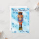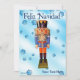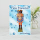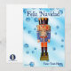 Casse-noix en bois allemand traditionnel représentant un officier de l'armée avec un uniforme bleu et orange. Le casse-noix est superposé sur une image arrière - plan bleue avec des flocons de neige. Le texte espagnol "Feliz Navidad" (Joyeux Noël) apparaît également. Ajoutez votre propre texte supplémentaire.