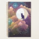 Le coucher du soleil colore les nuages surréalistes dans le ciel en bleu, violet, rose et jaune dans cette jolie illustration spatiale. Un chat noir est assis sur le croissant de lune, regardant les étoiles avec fascination. Va-t-elle atteindre et essayer d'en saisir une ?