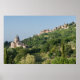 Affiche de la cathédrale et en haut de la colline la ville de Montepulciano en haut de la colline dans la vallée du Val d'Orcia en Toscane, Italie.
