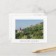 Carte postale de la cathédrale et en haut de la colline la ville de Montepulciano sur la colline de Val d'Orcia en Toscane, Italie avec une frontière blanche et le texte : 'Montepulciano'.