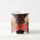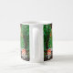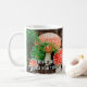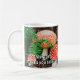 Photographie de trois champignons agariques à la mouche sous un pin. Conception imprimée sur les deux côtés de la tasse. Texte personnalisable : "Ce côté vous rend plus grand" d'un côté et "Ce côté vous rend plus court" de l'autre, citations d'Alice in Wonderland.
