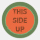 Texte "This side up" sur cercle orange, sur arrière - plan vert foncé. Chaque fois que les choses pourraient être tournées à l'envers. Déplacer ou simplement pour une utilisation pratique dans votre stockage. La couleur vert foncé peut être customisée.