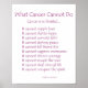 Poème "Ce que le cancer ne peut pas faire" présenté en texte rose. Utilisez les options personnalisées pour modifier la couleur de l'arrière - plan. Ce que le cancer ne peut pas faire Le cancer est si limité... Il ne peut pas paralyser l'amour Il ne peut briser l'espoir Il ne peut pas détruire la foi Il ne peut pas détruire la paix Il ne peut pas tuer l'amitié Il ne peut pas supprimer les souvenirs Il ne peut pas réduire au silence le courage Il ne peut pas envahir l'âme Il ne peut pas voler la vie éternelle Il ne peut pas vaincre l'esprit. -Auteur inconnu Cette affiche fait un don inspirant pour le cancer!