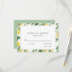 La première saison d'une récolte de citron s'étend de la fin de l'hiver au début de l'été. Cependant, vous pouvez célébrer le plaisir d'une fleur d'agrumes toute l'année avec cette faire-part de mariage à thème citronnier rsvp. Cet article particulier est doté d'un motif citron vert et jaune vif ainsi que de vos détails mariages en gris foncé ou vert. L'envers est vert jade pour compléter l'avant. Parfait pour les mariages du printemps et de l'été, mais excellent toute l'année.