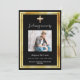 Un programme de funérailles/célébration de la vie élégant, moderne et simple. Un arrière - plan noir classique décoré d'une fausse croix d'or et de cadres faux or. Personnalisez et ajoutez un nom photo et des détails. Texte blanc.