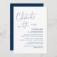 C'est la carte d'invitation de la fête d'élopement de mariage, avec un design de script Navy Blue minimaliste / minimaliste classe (Célébrez avec nous)
