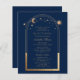 Celestial Blue Gold Sun Moon Astronomy Quinceañera Invitations dispose d'un élégant soleil doré, lune et étoiles avec un cadre doré sur un arrière - plan bleu. À l'intérieur est votre Quinceañera personnalisée d'informations d'invitation. Personnalisez en modifiant le texte dans les zones de texte. Conçu pour vous par Evco Studio www.zazzle.com/store/evcostudio