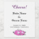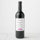 Un modèle de étiquette de bouteille de vin personnalisé avec des lettres de script violet, une lettre noire pour les noms de Mariée et de Salle et plus de place pour votre lieu et votre date personnalisés, avec une gravure vintage du slipper de verre de Cendrillon sur un coussin de patchwork rose.