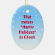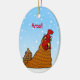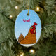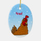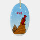 Ce modèle en céramique fait sur commande d'ornement de Noël a un poulet mignon de bande dessinée vous regarder curieusement. Au-dessus de la poule, il indique, "Aroo !" Les amants de poulet connaissent ce bruit. Le dos indique, "que les moyens "bonnes fêtes" dans Chook." L'arrière - plan est ciel bleu et neige en baisse.