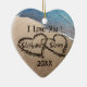 Ajoutez facilement vos propres noms faits sur commande ou n'importe quel texte (montrés l'exemple dit : "Je t'aime !" et ajoutez juste l'année désirée) avec des noms des couples heureux des amoureux dans les coeurs pour personnaliser ce bel ornement populaire de forme de coeur avec une photo originale de deux coeurs écrits dans le sable le long de l'eau bleue d'océan pour signifier des histoires d'amour. Le grand concept pour l'amour, voyage, s'est juste marié, et des économies prochaines d'été les mariages de plage de date, l'anniversaire, et la Saint-Valentin. Un ornement d'amusement, mignon, personnel et unique de souvenir à donner elle ou lui, que le special quelqu'un, amie ou ami, futurs jeunes mariés ou tous les amoureux couplent. Cette coutume, conception personnalisée est d'un côté et est disponible avec la conception des deux côtés aussi bien.