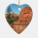 Un ornement en céramique en forme de coeur, avec un trait de grès rouge de la zone "roche à nappes" du haut-est du Parc national de Sion, s'illumine au petit matin de lumière dorée, avec de hauts pins ponderosa ponctuant le paysage rocheux d'ocher ici et là. La petite mesa en grès présente la géologie unique que l'on trouve dans cette partie du parc. Les couleurs et les composants principaux de cette image sont le rouge et le rocher d'ocher, le ciel bleu et les pins verts. Le texte peut être modifié ou supprimé à l'aide du modèle Personnalisez-le et la bannière Sion peut être supprimée en cliquant sur le lien Effacer sous lequel Personnalisez le modèle. Vous pouvez modifier les polices de texte, la taille, la couleur, la position et l'alignement en cliquant sur le bouton Customiser.