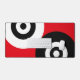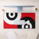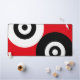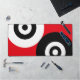 Art abstrait avec des formes géométriques de cercles noir et blanc sur fond rouge.