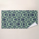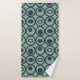 Ce kit de serviettes est muni d'un linge vert clair, d'une serviette bleue à main et d'une serviette de bain avec un design géométrique de cercles en rangs avec des cercles ou ovales à l'intérieur en bleu sur un champ de vert.