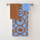 Ce kit de serviettes est muni d'un linge bleu clair, d'une serviette brune et d'une serviette de bain aux motifs géométriques de cercles alignés avec des cercles ou des ovales à l'intérieur en marron sur un champ de bleu.