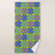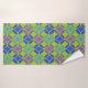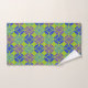 Cet ensemble de serviettes a un design moderne du milieu du siècle des cercles ouverts sur des cercles fermés en bleu, vert et violet sur un champ de vert.