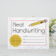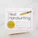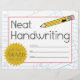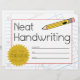 Un certificat de remise de prix en classe pour récompenser les élèves pour leur écriture manuscrite soignée. Arrière - plan est une illustration en papier carnet. Le design comprend également des illustrations d'un crayon jaune et d'un sceau d'or.