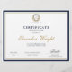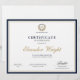 Reconnaissez les réalisations avec un certificat personnalisé de reconnaissance présentant un design raffiné avec une bordure bleu marine et or. Ce modèle de certificat élégant est entièrement personnalisable, vous permettant d'ajouter le logo de votre entreprise, le nom du destinataire, la signature et les détails de l'événement pour une présentation soignée et professionnelle.