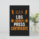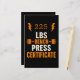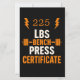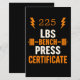 Célébrez vos gains de levage avec cette conception hilarante de certificat de presse Bench! Idéal pour les amateurs de gym, les amateurs de fitness, ou comme un cadeau amusant pour les copains de gym. Typographie LBS audacieuse et graphisme barbell en font un décor exceptionnel pour toute salle de musculation ou salle de gym à domicile.