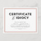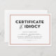 Si vous avez fait quelque chose, vous n'auriez pas dû vous excuser avec cette carte postale amusante Certificat d'Idiocie. Espace sur le devant pour personnaliser avec votre nom et signature et espace à l'envers pour des excuses plus longues. Noir, blanc et rose.