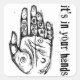 J'ai eu l'idée de ce design un jour en passant devant la vitrine d'un lecteur psychique. Le destin n'est pas seulement écrit entre vos mains, mais c'est aussi à vous de le faire arriver. J'ai ajouté plusieurs symboles et mots qui ne sont pas liés à la divination mais qui sont destinés à représenter toutes les choses que vous pouvez faire arriver avec vos mains : le changement, la création, le jeu. D'autres symboles incluent une rivière, une spirale, un triangle pour le changement, un coeur et un engrenage.