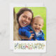 Carte de vœux verticale personnalisable avec la mention 'It's Christmas', décorée de flocons de neige, de brindilles de feuilles, de baies, d'un cerf, d'une poire et de texte vert qui lit CHRISTMAS avec un espace pour ajouter votre photo sur le devant, un fond vert avec une brindille de feuille bleue au dos et un espace pour ajouter votre nom et votre message ainsi que l'année en cours.