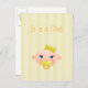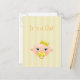 Une jolie faire-part de naissance dans les tons jaunes, un joli visage de bébé fille avec une sucette et un arc sur un arrière - plan rayé jaune pastel.