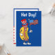 Hot Dog! C'est une invitation drôle pour une fête du 4 juillet. Une invitation hilarante pour une fête de l'Indépendance, un pique-nique, un BBQ ou un barbecue. Idéal pour une fête de grill dans le jardin ! Il présente un hot dog de dessin animé portant un chapeau patriotique et tenant un drapeau américain !