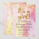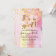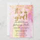 Tendance, cette invitation présente un fond aquarelle rose et un lettrage en faux or et des confettis qui tombent en arrière-plan.