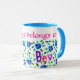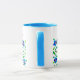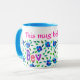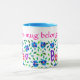 Une tasse blanche avec une jante et une poignée bleu poudreuse, décorée d'un collage de papier peint à la main fleuri et les mots "Cette Mug appartient à Bev". Lave-vaisselle et micro-ondes.
