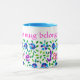 Une tasse blanche avec une jante et une poignée bleues en poudre, décorée d'un collage de papier peint à la main fleuri et les mots "Cette Mug appartient à Jane". Lave-vaisselle et micro-ondes.