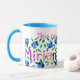 Une tasse blanche avec une jante et une poignée bleu poudre, décorée d'un collage de papier peint à la main fleuri et les mots "Cette Mug appartient à Miriam". Lave-vaisselle et micro-ondes.