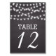 Chaîne de lumières sur tableau noir numéro de table mariage d'été avec un fil de lumières brillant de scintillement blanc sur le dessus sur tableau noir. Ce design mariage moderne et branché fait partie d'un ensemble ou d'une collection de mariages, est entièrement personnalisable et est parfait pour une nuit d'été mariage rustique en plein air.