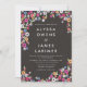 Belle, colorée invitation à un mariage de tableau noir floral! ! Personnalisez les invitations avec vos détails en ligne. Texte moderne simple encadré de fleurs sauvages colorés peints à la main en rose, bleu, jaune et blanc, contre un arrière - plan noir de tableau noir texturé.