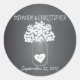 Style Chalkboard tendance avec typographie d'apparence manuscrite, personnalisée avec les noms de la mariée et du marié et la date du mariage. Joli pot de mason pleine fleurs d'hydrangée blanche est accentué d'un coeur qui tient les initiales des couples. Coordonner avec beauté tous nos produits et invitations de style tableau noir.