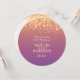 De belles bulles de champagne graphique effet faire-part de mariage dans les teintes violet et orange doré. Une faire-part de mariage contemporaine simple, avec un effet de bulle graphique art. Parfait pour un mariage moderne à bulles et champagne. Modifiez cette invitation avec vos propres mots. Conception et graphisme par Sarah Trett.