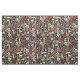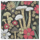 Ce tissu présente des champignons et des fleurs rouges, vertes et bronzés sur un arrière - plan noir.
