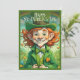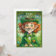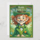 🍀 Une jeune fille joyeuse vêtue comme un leprechaun poutres d'excitation, tenant un cadeau doré magnifiquement emballé. Elle porte une tenue verte et vibrante, avec un chapeau haut orné de shamrocks, une cravate arc et des boutons dorés. L’arrière - plan saisit une scène de ville festive avec des confettis dans l’air, ce qui renforce l’esprit joyeux de la Saint Patrick. L'image rayonne de chance, de bonheur et de célébration. ✨
