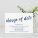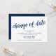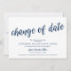 Ceci est une carte d'annonce de mariage reporté (report), avec titre de carte, Changement de date, en police de caractères Navy Blue script, sur un thème de design Moderne Rustique.