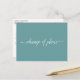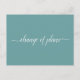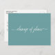 Cette carte postale simple est un moyen élégant et sophistiqué de faire savoir à vos invités si vous êtes dans l'éventualité malheureuse d'avoir à modifier ou à reporter vos plans de mariage. Le recto est d'une jolie couleur sarcelle et mentionne "changement de plans" en calligraphie blanche élégante, et le verso comporte un espace pour une note personnalisée où vous pouvez expliquer la situation à vos invités.