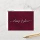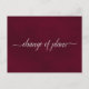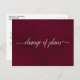 Cette belle carte postale est conçue pour tenir vos invités informés si vous devez annuler, modifier ou reporter vos plans de mariage. Elle présente un design simple mais élégant avec le texte "changement de plans" écrit en calligraphie sur un fond marbré bordeaux. Le dos est un espace de note personnalisé où vous pouvez expliquer tous les détails à vos invités. Bien que conçue pour les mariages, cette carte est suffisamment polyvalente pour être utilisée pour tout événement ou célébration.