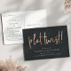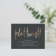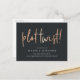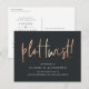 Besoin de changer la date de votre mariage ? Informez vos invités avec cette carte postale moderne et légère qui présente "changement de programme !" en lettrage manuscrit de style cuivre sur un fond noir riche et doux. Personnalisez avec vos noms et la nouvelle date de mariage en dessous en lettrage blanc.