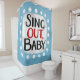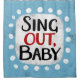 "Sing Out, Baby" est un design de texte mignon en bleu clair avec du texte en noir et rouge, avec une forme d'accent blanc et des points blancs texturés blancs qui l'entourent.
