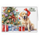 Sur le devant de cette carte de vacances, un beau chien Labrador Retriever jaune porte un chapeau de Père Noël rouge et blanc. À côté de lui se trouve un arbre de Noël décoré et des cadeaux de Noël emballés. Le texte scriptural en haut dit "Joyeux Noël". Tout le texte à l'intérieur est facilement personnalisable, vous pouvez donc le faire dire ce que vous voulez. Voir plus d'images de Retriever, ainsi que des dizaines d'autres produits de race de chien, sur Dog Village.