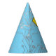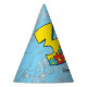 Un robot bleu et jaune mignon sur un arrière - plan de circuit d'ordinateur. Grand casquette de fête d'anniversaire pour trois ans !