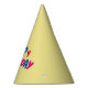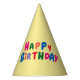 Une variété de lettres colorées forment les mots Joyeux Anniversaire sur un casquette de fête jaune vif.