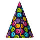 Une invitation dynamique et ludique à l'anniversaire avec un design psychédélique et d'inspiration rétro. L'arrière - plan sombre est décoré de formes colorées et tourbillonnantes, de lignes abstraites et de touches de couleurs vives rappelant les années 1970. La bordure est un motif amusant de visages souriants multicolores, avec des étoiles et des bulles éparpillées dans le design. Le texte est un mélange de polices audacieuses et ludiques, avec des détails clés surlignés en bleu vif et rose.