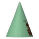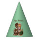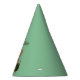 Ce casquette de fête personnalisé est d'une couleur vert menthe avec deux chats souriants amusants. La chatte-dame donne au chat mâle brun un un cadeau de rats de son panier de bois vert. Customisez le texte Joyeux anniversaire avec le modèle.